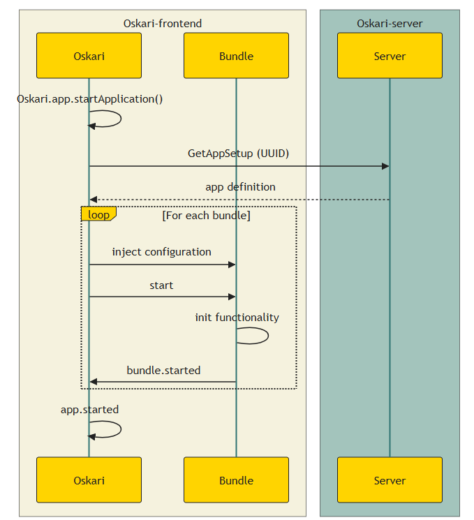 ### Frontend - bundle #### index.js ```javascript import { MyBundleInstance } from './instance'; Oskari.bundle('hello-world', () => new MyBundleInstance()); ``` #### instance.js ```javascript import { BasicBundleInstance } from 'oskari-ui/BasicBundleInstance'; class MyBundleInstance extends BasicBundleInstance { start (sandbox) { super(sandbox); console.log('Hello world') } } ```